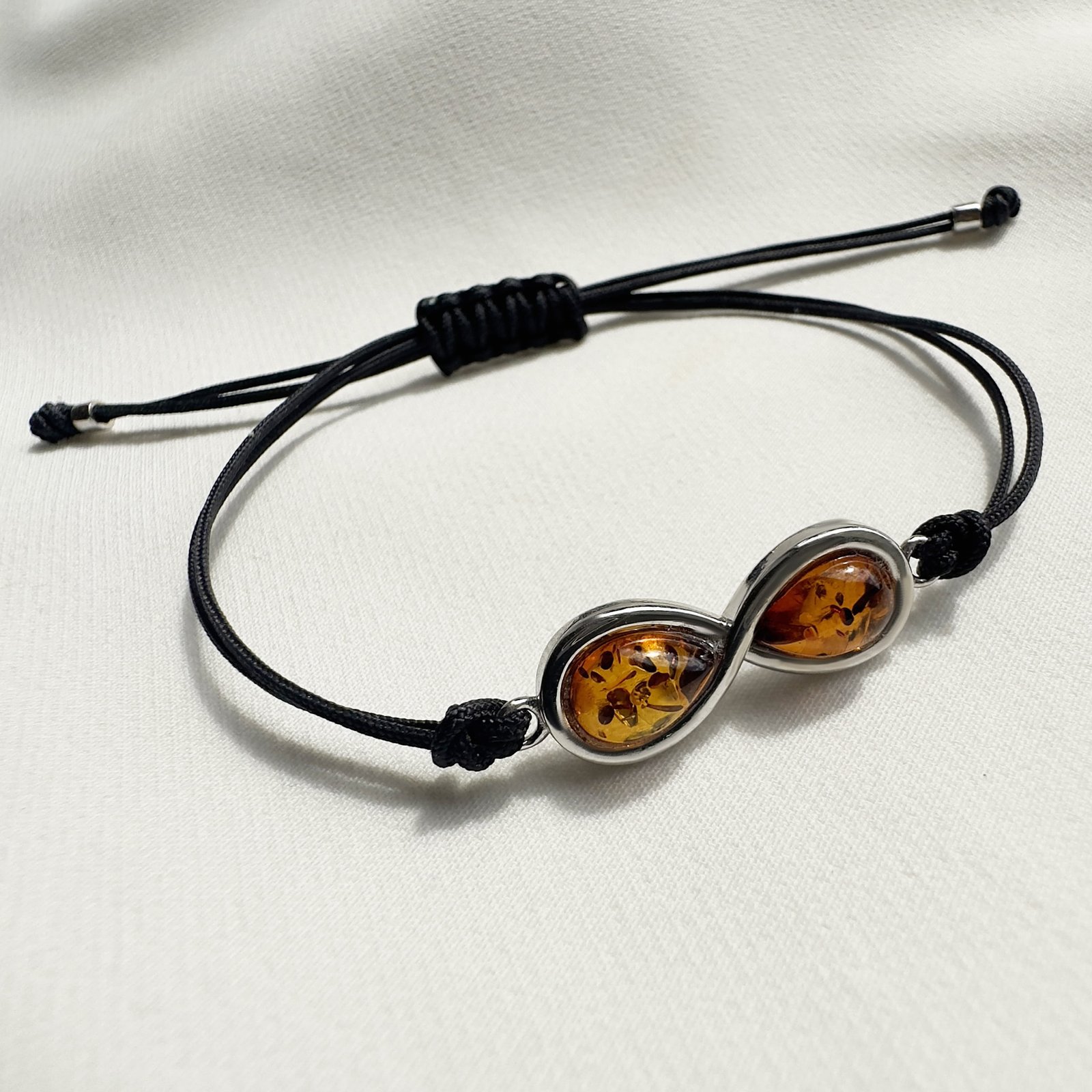 Bransoletka srebrna na sznurku nieskończoność z bursztynem Bransoletka srebrna na sznurku nieskończoność z bursztynem