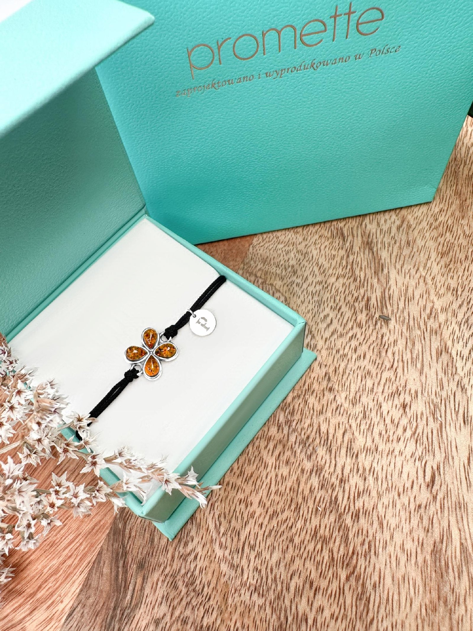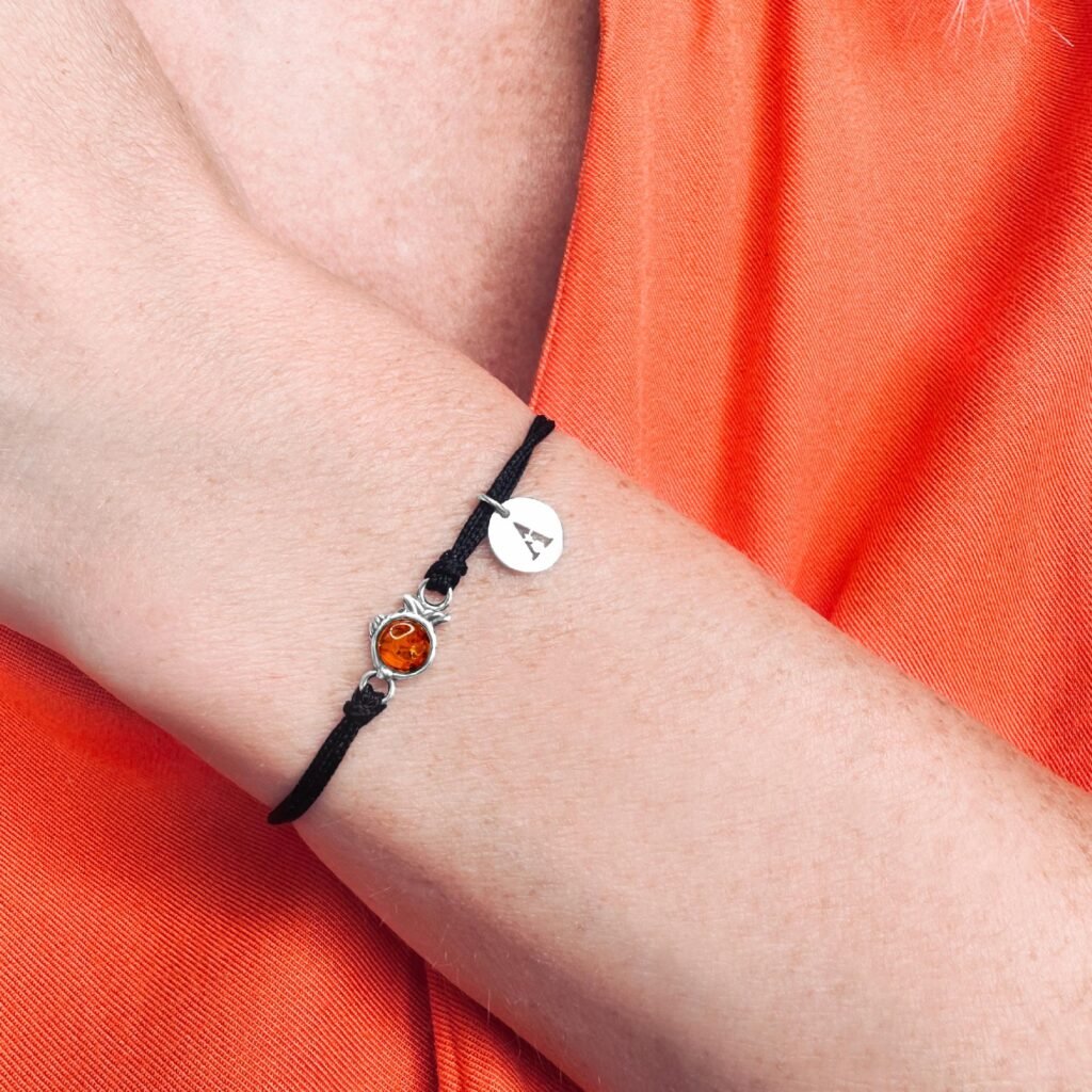 SREBRNA BRANSOLETKA NA SZNURKU Z NATURALNYM BURSZTYNEM I TWOJĄ LITERKĄ